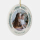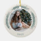 O Enfeites de natal fotográfico festivo apresenta uma foto favorita em cada lado, emoldurada por bugs coloridos de pínus e bagas ocas em um fundo de marfim macio. Personalize com uma legenda personalizada em cada lado; mostrada com nomes e o ano.
