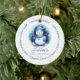 Simplesmente perfeito, o primeiro enfeite de Natal do Bebê Foto Lado, com um doce boneco de neve vestindo um chapéu azul, lenço e luvas com coroa estendida pela mão moderna.
