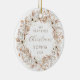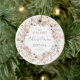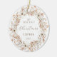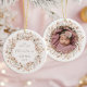 Celebre o primeiro Natal do bebê com este ornamento de manutenção, apresentando uma coroa de flores silvestres em tons neutros de terra e cores pastéis. A palavra "Natal" aparece em delicada escrita manual. Personalize o ornamento com o nome do bebê e o ano na fonte sans serif de um lado e sua foto favorita do outro.