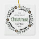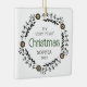 Celebrar o primeiro Natal do bebê com este ornamento de manutenção, apresentando uma coroa de arte folclórica de estilo escandinavo de verde rabugento e flores. A palavra "Natal" aparece a verde. Personalize o ornamento com o nome do bebê e o ano em fontes de sans negras serif de um lado e sua foto favorita do outro.
