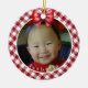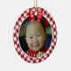 Xadrez de búfalos vermelhos e brancos, também conhecida como xadrez de Lumberjack está na beira deste Enfeites de natal fofo. Você personaliza o ornamento com sua foto favorita no centro e pode personalizá-lo com seu nome. Um arco vermelho com bolinhas brancas está no topo. O reverso diz: "Que toda a alegria do Natal esteja em seus corações por todos os dias da sua vida". Então você pode personalizá-lo com seus primeiros nomes ou por último e o ano.