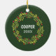 Enfeite de árvore de Natal de dezembro com espaço para personalizar ou personalizar com o nome de sua escolha em uma fonte elegante, uma foto pessoal do seu cão ou gato e data do ano de sua escolha. Com um lindo padrão de folhagem de folhinhas de azevinho verdes e frutas vermelhas sazonais elegantes como decoração. Lembrança única de memórias que os avós dos seus filhos peludos, outros membros da família ou seus amigos vão amar!