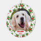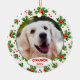 Enfeite de árvore de Natal de dezembro com espaço para personalizar ou personalizar com o nome de sua escolha em uma fonte elegante, uma foto pessoal do seu cão ou gato e data do ano de sua escolha. Com um lindo padrão de folhas de azevinho verdes sazonais e bagas vermelhas como decoração. Lembrança única que os avós dos seus filhos peludos, outros familiares ou amigos irão amar!