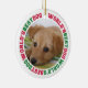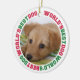 Mostre um pouco de amor aos seus amigos peludos com estes ornamentos de fotos. Esta lembrança mostra seu momento favorito de cachorro bonitinho com o texto "O melhor cão do mundo" como fronteira. Personalize ainda mais as costas com o nome do seu cão, que se senta numa pata impressa. Estes ornamentos são perfeitos para amantes de animais de estimação ou para qualquer um que recentemente se tornou dono de cães.