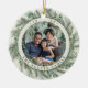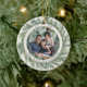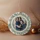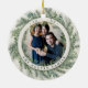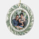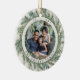 Elegante ornamento de fotos de feriado apresenta uma foto favorita em cada lado, enquadrada por uma coroa de luxuosa folhagem botânica verde em um fundo de marfim quente. Personalize com seu nome de família e o ano curvo em torno da foto.