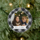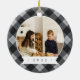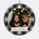 Um adorável ornamento fotográfico de dupla face mostrando uma foto favorita em cada lado, em uma cinza e fundo de xadrez de búfalo preto. Personalize com uma legenda personalizada na frente em letra manuscrita e adicione o ano no verso.