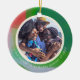 Personalize este ornamento cerâmico com duas das suas melhores fotos e texto personalizado e dê um presente de Enfeites de natal artístico e moderno aos entes queridos ou guarde para si mesmo um momento especial no tempo ou pessoa especial na sua vida. Cada lado tem uma foto única, enquadrada dentro de uma borda de um trajeto pintado e texturizado em tons de verde, vermelho, lilás pálidas e branco cremoso quente. O texto simples é fácil de personalizar com nomes, localizações ou datas e traz um sorriso para qualquer um que veja este adorável ornamento de Natal na festiva árvore de Natal.