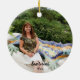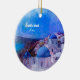 Santorini, Grécia — um dos lugares mais bonitos do mundo. Se você viajou até lá, você vai querer lembrar da viagem com este Enfeites de natal único com a famosa arquitetura azul-do-mar e branca e sua data de viagem, e sua própria foto no verso. Este Enfeites de natal único é um presente adorável para o viajante que ama a beleza da Grécia, ou qualquer um que queira comemorar sua viagem maravilhosa. Fotografia de Jean Beaufort, do dominio público, e efeito aquarela de TK Goforward.