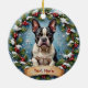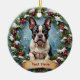 A beautiful, ultra-detailed Christmas ornament design featuring a realistic portrait of the breed centered within a soft, festive winter frame. This elegant design includes pine branches, red berries, and snowflakes against a snowy backdrop, illuminated by warm holiday lighting. The balanced, round composition includes clear space below the dog for customization.