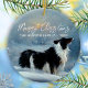 Borda Collie na neve de inverno Feliz Natal Ornamento de Férias. Paisagem de neve de inverno tranquila com uma adorável collie branca e negra. Feliz Natal em um roteiro de tendências. Ornamento de feriado para um proprietário de collie de fronteira. Você pode alterar o texto ou apagá-lo.