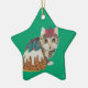 Este gatinho lindo de mesa de Natal está vestindo um arco vermelho muito bonito com um natal Holly na sua cabeça e ela está muito satisfeita consigo mesma enquanto lambe o creme de pudim de Natal das suas patas com sua pequena língua rosa. Seus olhos de gatinha mostram o quanto ela está gostando do seu especial brinde de natal. Este enfeites de natal original e bonito tem uma cor vermelha de fundo festiva de um lado e uma cor verde de fundo muito sazonal do outro lado, o lado vermelho tem uma imagem de gatinho melhorada digatalmente, eu dei a ele uma aparência gravada. O lado verde do ornamento em forma de estrela tem a imagem original de cor d'água do pequeno gato de mesa Eu acho que este ornamento de estrela festiva faz um maravilhoso pequeno presente para qualquer um, amigos, família, colegas e todos os amantes de gatos terão o prazer de receber esse enfeites de natal muito especial durante o feriado. Ou talvez você só queira se tratar com um adorável ornamento de natal.