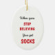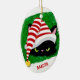 Este Enfeites de natal bonito trará alguns sorrisos nesta temporada! O rosto de um gato preto raivoso de preferencialmente está no centro da frente. O gato veste um chapéu de Papai Noel listrado vermelho e branco, e repousa sobre um fundo verde de Natal. Seu texto personalizado está em vermelho embaixo. A parte de trás do ornamento tem texto preto e vermelho que diz "Quando você deixa de acreditar que tem meias". Divertido, e tão verdadeiro!