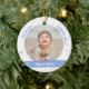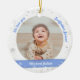 Trendy, elegante e fofo personalizou First Christmas Baby Ornament para bebês gêmeos para um padrinho branco com flocos de neve e estrelas que tem uma abertura redonda para uma foto horizontal personalizada, e uma banda azul curvada em cada lado na qual aparece o nome ou os nomes dos gêmeos em uma elegante fonte / tipografia. Esta design inclui na frente as palavras "Nós te amamos, avô Jason!", que você pode personalizar ou apagar. No verso há um texto personalizado para o ano do primeiro Natal dos bebês.