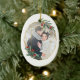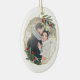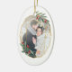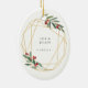 O Enfeites de natal fotográfico elegante apresenta uma foto favorita rodeada por uma falso estrutura geométrica oval de folha de ouro com folhagem de cor verde-d'água e bagas vermelhas. Adicione seus nomes e o ano, ou uma mensagem personalizada, ao lado inverso em um delicado quadro geométrico correspondente.