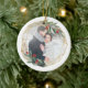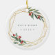 O Enfeites de natal fotográfico elegante apresenta uma foto favorita rodeada por uma falso estrutura geométrica de folha de ouro com folhagem verde de cor d'água e bagas vermelhas. Adicione seus nomes e o ano, ou uma mensagem personalizada, ao lado inverso em um quadro correspondente.
