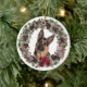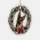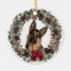 Na frente deste ornamento de Feriado está uma imagem de um lindo Cão German shepherd enquadrado por um cone de pinheira de aquarela bonito e uma orla de Feriado de Amoras. A imagem do cachorro está no centro em um fundo branco. Um arco vermelho brilhante dá um pouco de brilho de Natal à coroa. O verso do ornamento tem a mesma coroa com o texto personalizado em vermelho e verde escuro.