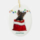 Na frente deste ornamento de Férias está uma imagem de um adorável filhote de German shepherd em uma bolsa de presente de Natal vermelha e branca. Atrás do cachorro há uma série de luzes coloridas de Feriado. O texto no final diz "Feliz Natal". A parte traseira do ornamento tem a mesma imagem com um campo de nome personalizado. Bonita!