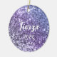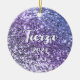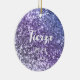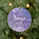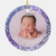 Um nome ousado moderno e uma data em branco com uma sombra azul escura num ornamento cerâmico redondo. O tamanho, a cor e o estilo da fonte são personalizáveis. O fundo é uma lavanda falsa, um cinturão de gradiente roxo e periwinkle com manchas cintilantes ou um manto indefinido. Adicione a foto da sua própria garota.