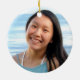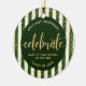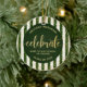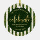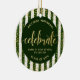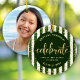 Este enfeite de foto personalizado é uma lembrança maravilhosa para seu graduado favorito ou seus familiares. A frente ostenta uma caligrafia manuscrita deslumbrante, moderna e cintilante com purpurina dourada falsa em um fundo listrado de verde caçador e branco com pontos de confete de purpurina dourada falsa. Personalize o texto personalizado com o nome do graduado, a escola e o ano de formatura. A foto personalizada dela está no verso. Escolha entre materiais de cerâmica, metal, vidro ou moldura de metal premium e um formato circular ou quadrado. Convites, cartões de agradecimento, enfeites de boina, guardanapos, pratos e outros itens para formatura também estão disponíveis nesta coleção moderna e elegante. Garantido para preservar memórias queridas da ocasião especial dela!
