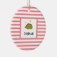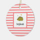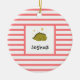 Elegante, moderno e fofo ornamento à volta de fotos de bebês em um padrão de listras vermelhas. Esta modelo com uma ilustração adorável do bebê dinossauro Verde dormindo sob as estrelas amarelas douradas com o nome de Bebê personalizado. Excelente para o bebê e para a menina. Presente perfeito para todas as estações!