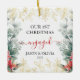 Celebre o feliz feriado de 1rua do seu noivado com uma foto personalizada de "Nosso Primeiro Natal Engajado", um ornamento de cerâmica de flores monololonas, que é verde-verde. Este design apresenta um verde-natalino na moda com cor d'água com florais de monolina de ouro, caligrafia de estilo manuscrito, nomes e anos de casal e uma fotografia da sua escolha. Esta única vitória de casamento adiciona um toque elegante às decorações das casas de Natal.