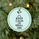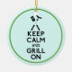 O ornamento cerâmico redondo, com uma imagem, em ambos os lados, da frase "Manter Calmo e Grill On" em letras negrito, tocado com utensílios de churrasco e um cachorro-quente no aqua. Fronteira verde. Veja a coleção inteira do Ornamento do Pai nos TOUCHES ESPECIAIS | Seção Favoritos para festas.