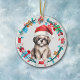 Na frente deste enfeite de Natal há uma imagem de um adorável cachorrinho Shih Tzu usando um chapéu de Papai Noel. O cão está cercado por uma guirlanda de Natal feita de ossos embrulhados, estrelas douradas, presentes e luzes de Natal. A parte de trás do enfeite tem a mesma guirlanda com texto personalizado em vermelho, dourado e verde. É fácil mudar o ano para um nome para personalizá-lo, se desejar.