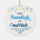 O Cute First HANUKKAH CASOU-SE COM ornamento cerâmico com NOMES PERSONALIZÁVEIS E ANO. Design mostra a tipografia do guiamento azul Hanukkah com estrelas azuis e amarelas penduradas. Duas estrelas vermelhas decoram a palavra "casado". Uma bela lembrança de casais celebrando seu primeiro Hanukkah casado. A design é repetida atrás. Versão hebraica disponível separadamente.