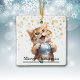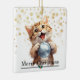 On this cute Holiday ornament, an adorable little ginger tabby kitten holds a stolen silver tree bulb. The text at the bottom front says "Merry Christmas". A gold snowflake background pattern adds interest to the design. The same image is on the back, but the text that says "Happy New Year" is a custom text field that you may easily change to a name or a signature, if you'd like.