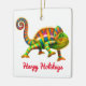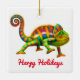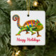 Trabalho de arte original fino de um lagarto colorido Panther Chameleon pela artista e designer Carolyn McFann do Two Purring Cats Studio impresso num Natal de cerâmica personalizável ou qualquer ornamento de férias para fãs de répteis. Excelente de presente para Herpetologista ou qualquer pessoa que ama animais!