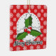 Holly sobre um fundo vermelho de flocos de neve branco com a legenda "Feliz Natal".