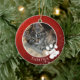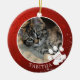 Ornamento comemorativo de dupla face com uma ou duas fotos do seu gato, com fundo vermelho com flocos de neve e estrelas e uma pegada de gato. Personalizado com nome e ano. (DICA DE FOTO: Escolha uma foto com o assunto no meio e/ou pré-corte em formato quadrado e use a aba ALTERAR na seção PERSONALIZAR.) Entre em contato com o designer via Zazzle Chat ou makeitaboutyoustore@gmail.com se você gostaria que este design fosse modificado ou ajudado a transferi-lo para outro estilo de ornamento ou outro produto.