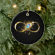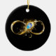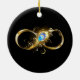 Símbolo Dourado e brilhante do infinito, decorado com pena de joalharia de pavão com turquesa sobre fundo preto.