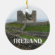 O ornamento irlandês mostra uma foto do castelo de O-Brien em Inisheer, na costa irlandesa, com paredes de pedra, grama verde e vista do oceano.