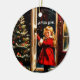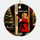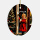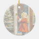 Ornament cerâmico com um charmoso design gráfico de Natal inspirado na safra. Uma garotinha fofa em casaco vermelho está parada na porta. Ela está sorrindo. A noite estrelada ao ar livre contrasta lindamente com a festiva árvore de Natal no corredor. Vem com o desejo de Natal francês "Joyeux Noel" . Usando as ferramentas versáteis do Zazzle, você pode personalizar texto e fontes sem esforço. _______________ Design, feito em colaboração com a Canva AI e a Alma Wad, a designer humana.
