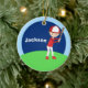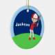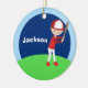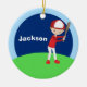 Legal ornamento personalizado de jogador de beisebol para uma criança que joga na Little League ou T Ball. Este lindo presente de Natal mostra uma criança vestindo um uniforme vermelho de baseball e segurando um morcego contra um fundo azul em um campo verde. Personalize adicionando um nome em branco no céu azul.