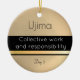 Ujima significa trabalho coletivo e responsabilidade e é o princípio para o terceiro dia de Kwanzaa. O ornamento tem um fundo dourado e linha decorativa, e as palavras são em preto e branco. Este ornamento faz parte de um conjunto de sete itens que mostra os princípios para cada dia de Kwanzaa. Vejam todos.
