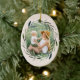 Elegante ornamento de foto de dupla face enquadra uma foto favorita com uma coroa oval de folhas verdes de laurel de aquarela sobre um fundo de madeira clara. Personalize as costas com sua legenda personalizada (mostrada com "[name's] first Christmas" e o ano. Perfeito para o primeiro Natal do bebê, o primeiro Natal casado, ou para comemorar um ano especial.