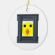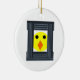 Este pingente bonito tem uma mensagem muito séria. O design apresenta um pintinho amarelo com olhos pretos e um bico laranja a espreitar atrás de uma gaiola quadrada de metal. O texto no verso diz Liberte as galinhas da bateria. Reflete os meus problemas pessoais com a forma como os animais são mantidos e explorados para uso humano em todo o mundo.