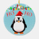 Um desenho bonito de pinguim preto e branco. Ho, ho, ho! ornamentos cerâmicos de bebês animais. Aquela versão do Papai Noel com luzes de Natal no fundo. Ideia de presente para crianças.