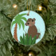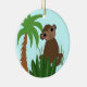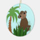 Um macaco bebê giro brincando na grama perto de uma palmeira.
