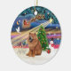 Um Chow Chow vermelho é o ponto focal desta charmosa design com alguns dos principais símbolos do Natal - os três sábios, a estrela de Bethlehem, uma árvore de Natal decorada, um boneco de neve, uma pomba de paz e Papais noeis e sua rena voando através do céu noturno estrelado.
