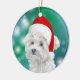 Na frente deste ornamento de Feriado está uma imagem aquosa de um pequeno cão maltês branco vestindo um chapéu vermelho brilhante de Papai Noel. A imagem destaca-se em relação a um fundo verde gradiente e a um fundo azul. A parte de trás do ornamento tem o mesmo pano de fundo com texto branco personalizado que diz atualmente "Feliz ano novo Feliz de Natal". Bonita para qualquer pessoa, mesmo que não seja "detida" por um maltês!