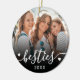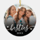 Crie um souvenir personalizado com este enfeite de Natal personalizado, apresentando um design doce em ambos os lados. A frente inclui espaço para uma foto favorita com a palavra “besties” escrita na parte inferior em uma fonte cursiva fluida, acentuada por pequenos detalhes de coração e a data do ano.