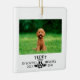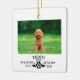 Ornamento de foto em memória amorosa para um memorial de animal de estimação com uma impressão de pata e asas de anjo. A parte de trás também pode ser personalizada com o nome e anos. Esta lembrança apresenta uma sobreposição branca na parte inferior para fazer o texto se destacar.