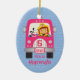 Soe os alarmes para sua menina do aniversário! Ornamento bonito do aniversário da lembrança do aniversário para meninas com um sapador-bombeiro de sorriso da menina que conduz um carro de bombeiros cor-de-rosa acompanhado de seu cão Dalmatian adorável do fogo. O texto na matrícula diz a MENINA do ANIVERSÁRIO. Fundo afligido da parede de tijolo. Faça original com seus próprios ano do aniversário e texto customizável.