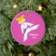 Personalize facilmente isto caçoa enfeites de natal das artes marciais. Uma ilustração de cabelo loura bonito da menina, vestindo um uniforme branco e uma correia roxa em um fundo cor-de-rosa com estrelas. Aperfeiçoe para todo o pouco estudante do karaté ou do taekwondo. ANTES QUE você colocar sua ordem -- Contacte-nos para a COR LIVRE MUDA (cor da correia, cor do cabelo, cor do fundo, etc.)