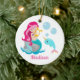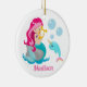 Personalize este belo Enfeites de natal de sereias rosa, acrescentando o nome do seu filho. Design de uma sereia com bonito entrelaçamento de oceano submarino e bolhas de mar. Bonito presente para uma praia ou piscina no verão.