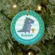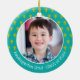 Este enfeite de foto personalizado é uma lembrança maravilhosa para o seu graduado do jardim de infância favorito ou para os membros da família dele. A frente ostenta uma visual caprichoso e divertido de um t-rex azul-marinho fofo, ousado e kawaii, e uma tipografia divertida e manuscrita sobre um fundo listrado de azul-turquesa claro e branco. Um padrão de palmeira adorável sobreposto ao azul-turquesa está na borda, enquadrando a ilustração. No verso está a foto de sua escolha. Personalize o texto personalizado com o nome do graduado e o ano da turma. Personalize o texto personalizado com o nome do graduado e uma mensagem especial. Escolha entre materiais de cerâmica, metal, vidro ou moldura de metal premium e um formato circular ou quadrado. Convites, faixas, pratos de papel e guardanapos, adesivos e outros itens para formatura também estão disponíveis nesta coleção especial e legal. Garantido para preservar memórias queridas desta ocasião especial!