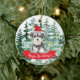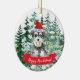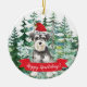 Um Enfeites de natal de Cachorro Miniatura Schnauzer, datado e bonito, colocado sobre um fundo de pinheiros e pinheiros com a mensagem de feriado "Feliz Howlidays" e personalizado com o nome do cão. Visite nosso compro para ver uma grande variedade de pães de cão